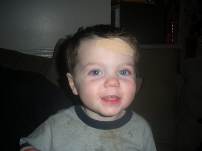 My poor baby. J.B. was chasing Jett down the hall and he tripped over some blankets I had left on the floor and crashed right into the corner of the wall. We didn't take him to the Dr. so we had his Uncle Austi & J.B. fix it with dermabond. It looks way better than this. I felt so bad :(